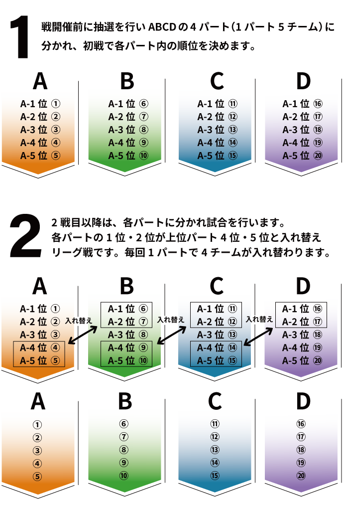 - 1パート5〜6チームでのルーグ戦。1日で1チーム4試合と審判を行います。